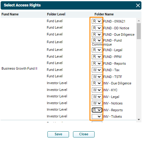 ) in the Actions column. Select Access Rights window is displayed. Give Read or Write access for various folders at the fund level and investor level to the user. Click Save. The access rights are updated.