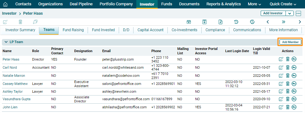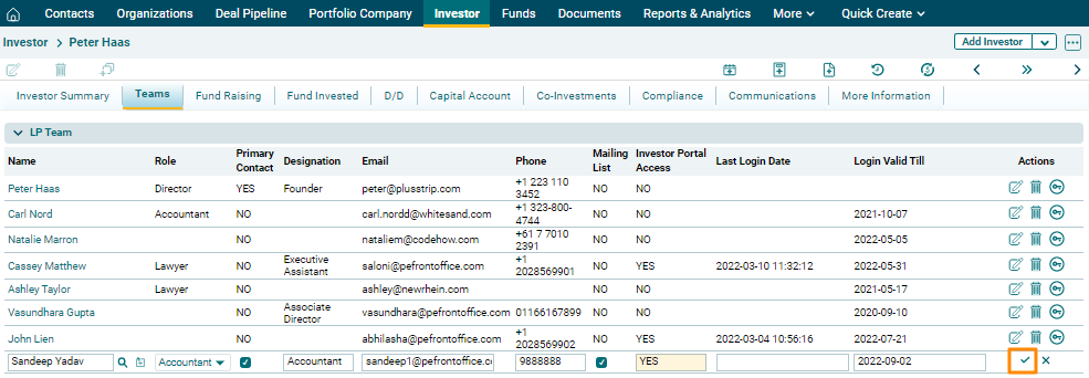 LP Team panel captures details of team members of limited partners associated with the investor. The details included are: