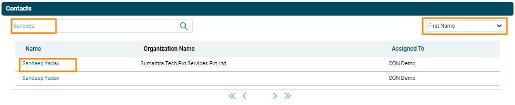 The Contacts window is displayed. Search for the contact name. Select the filter on the top left corner. Search results are displayed. Click on a Contact Name to add them as a member.