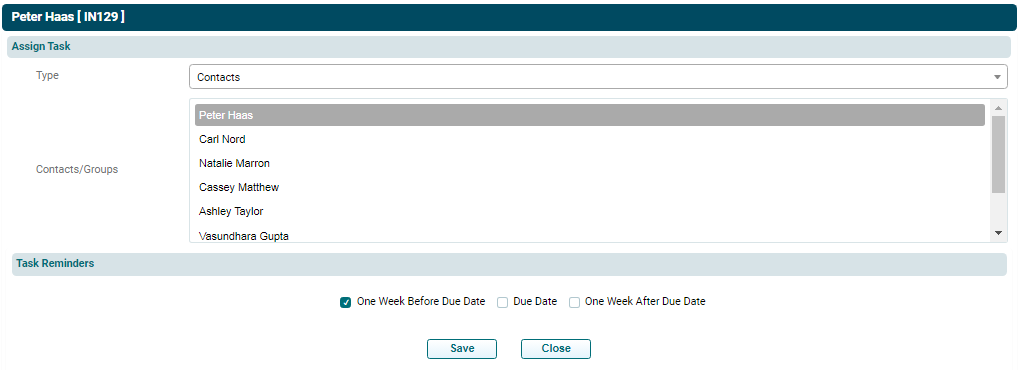 Select the Type, i.e. Contact or Groups. Select the Group or Contact. Check one of the task reminder box, i.e. One Week Before Due Date, Due Date, One Week After Due Date. Click on Save.