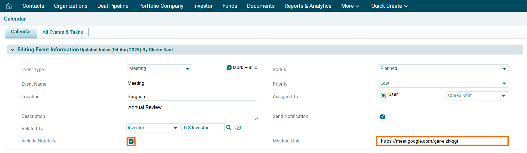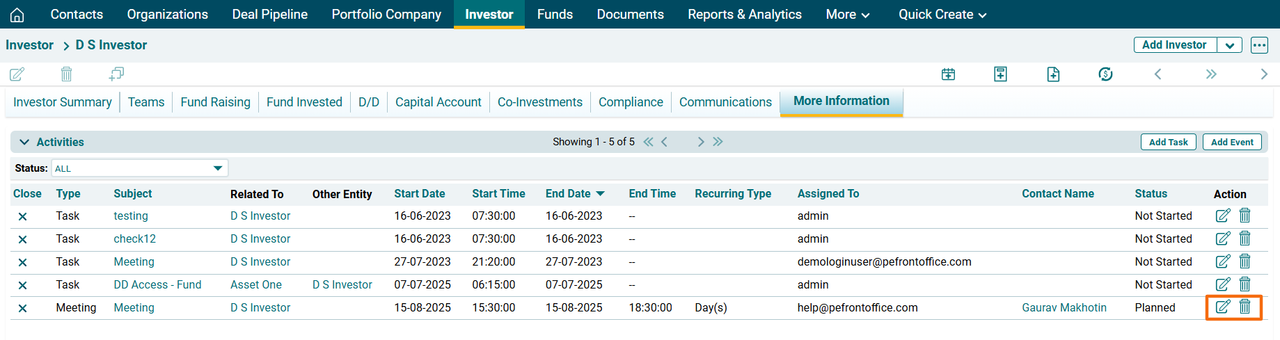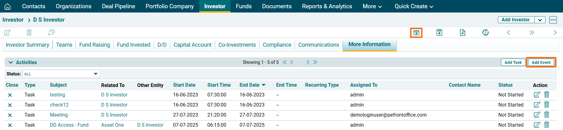 1. Click on a Investor Name for which event has to be created.