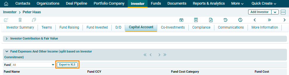 To export the fund expense and income details into excel, click on the Export to XLS button in the horizontal bar of the panel. The excel file will download.