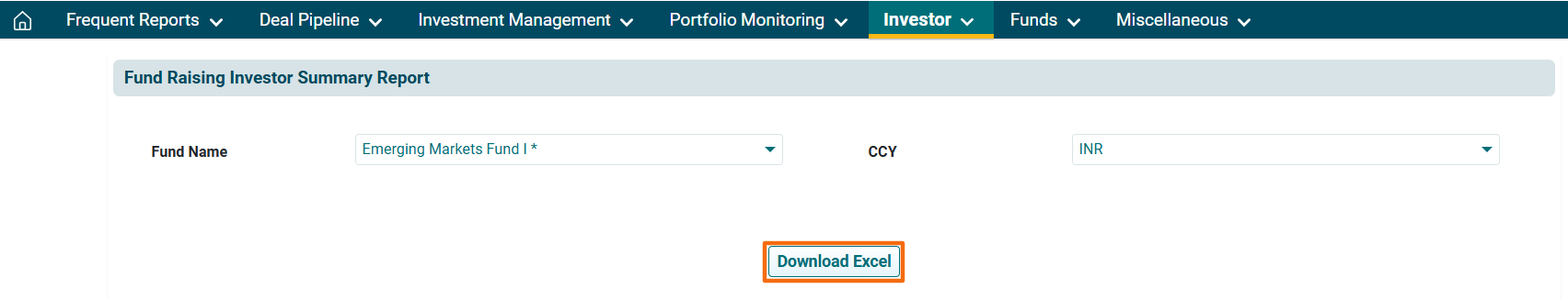 3. The Fund Raising Investor Summary window is displayed. Choose the fund and currency from the drop-down list. Click on Download Excel button. The report will be downloaded.