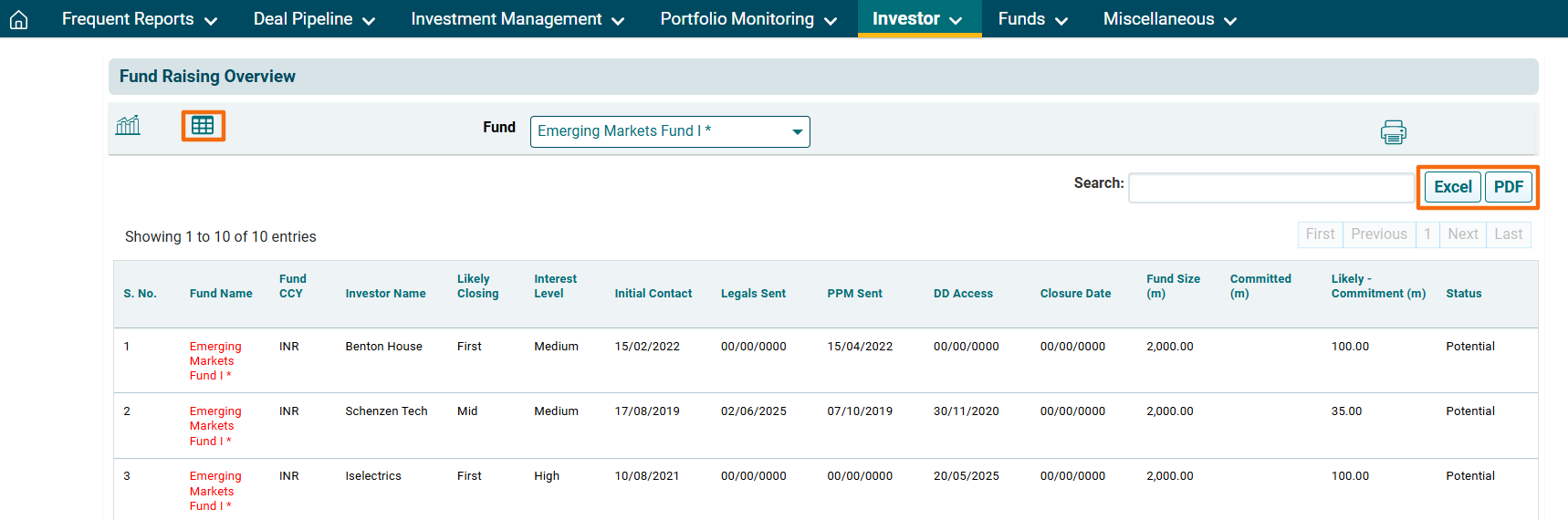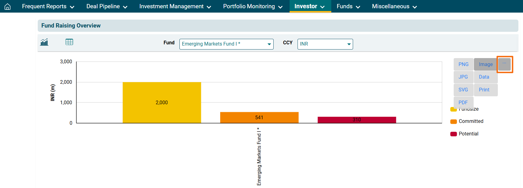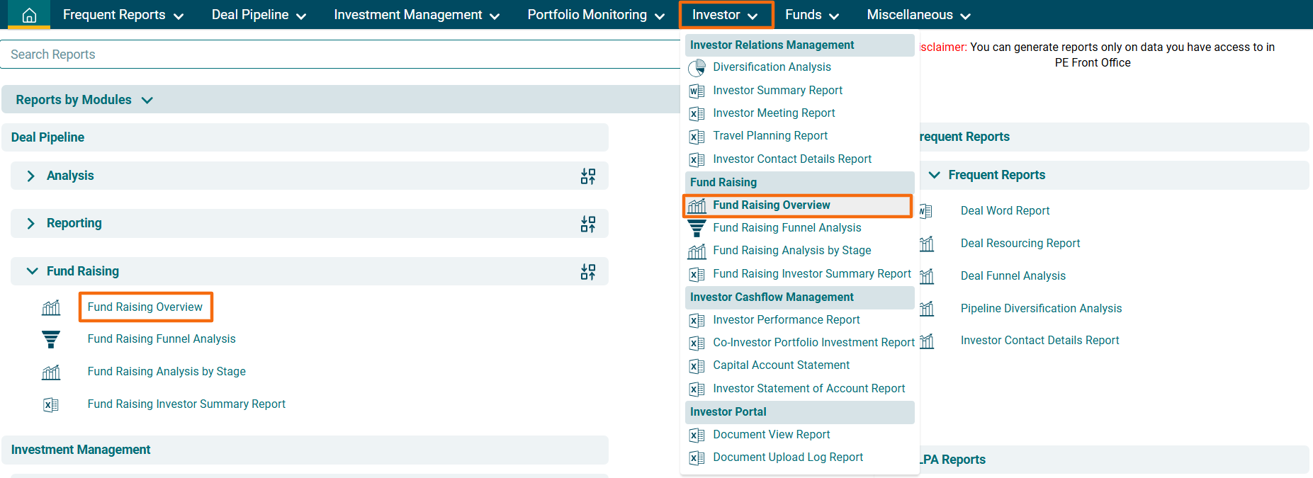 2. You can access the report from the dashboard by clicking Fund Raising Overview in the Investor panel or from the Investor drop-down menu in the blue vertical bar.