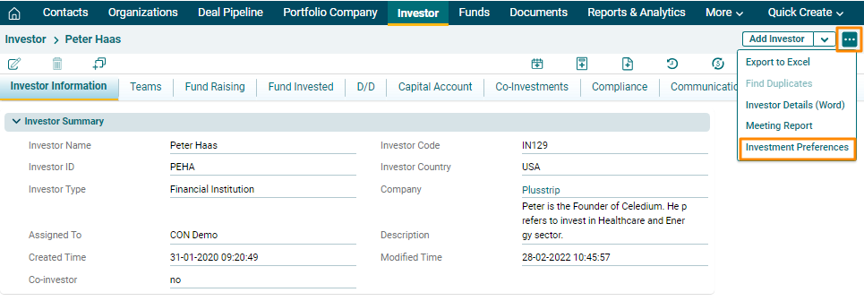 & Analytics window is displayed. In the Investment Preferences panel, apply