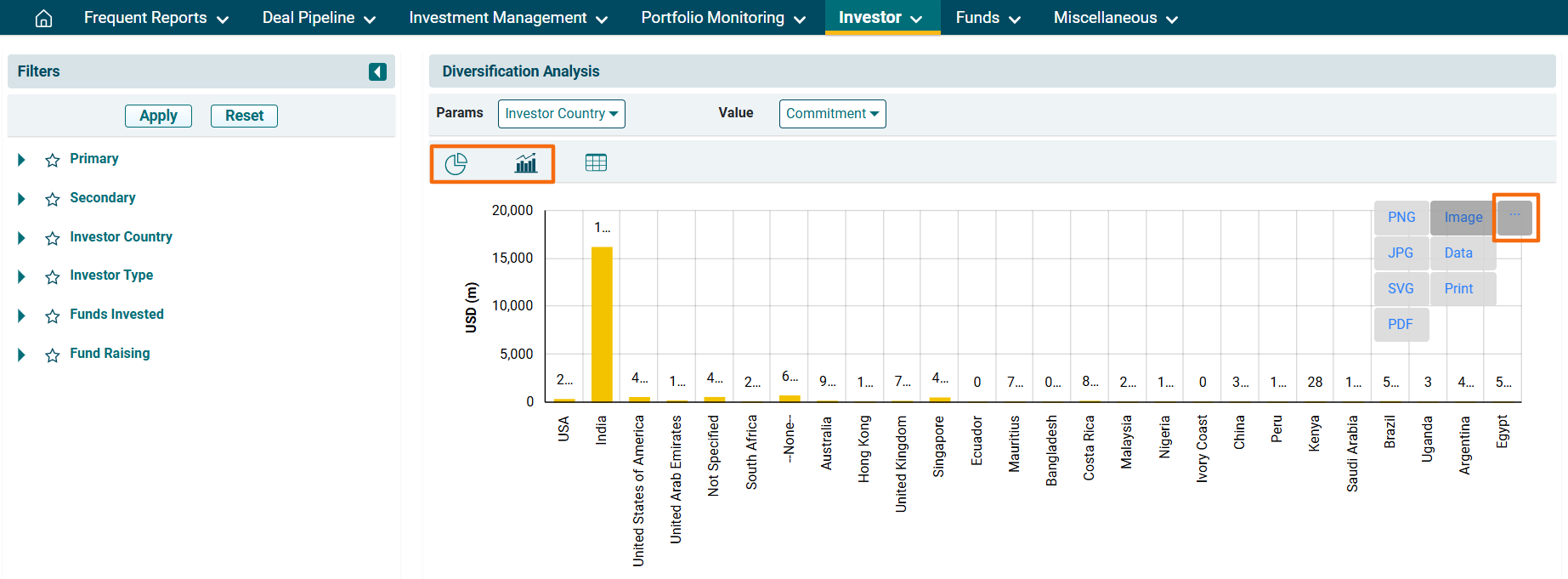 5. You can view the above data in Bar Graph and Pie Chart. Click on the icons below the filters to view the diversification in the desired format. You can download the report in various formats. Click on the gray square box button in the top right corner near the graph. The report can be downloaded in image formats, such as PNG, SVG, JPG, etc., and data formats, such as JSON, HTML, PDF, CSV, etc. Click on a format and the report will be downloaded.