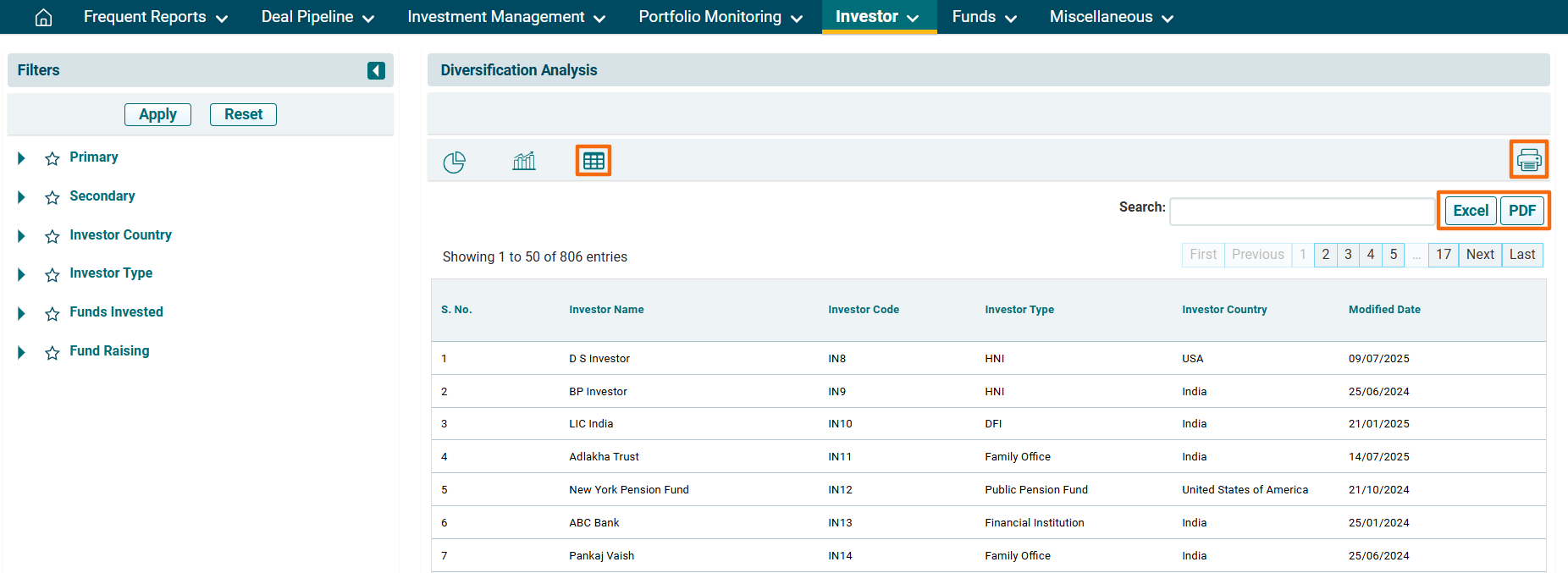 2. You can access the report from the dashboard by clicking Diversification Analysis in the Investor panel or from the Investor drop-down menu in the blue vertical bar.