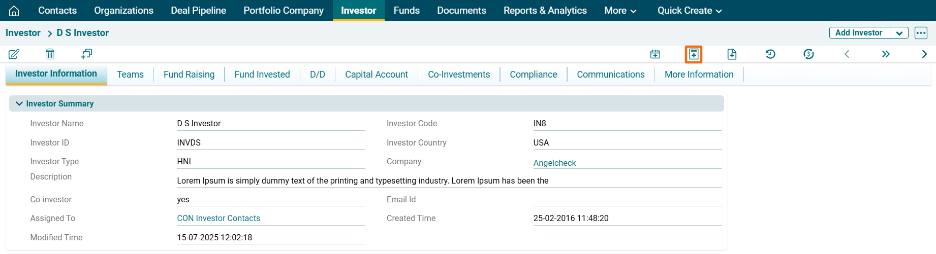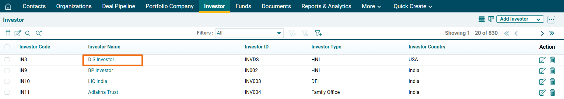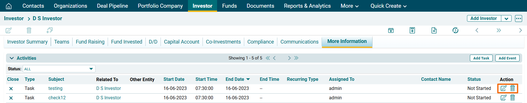 1. Click on the Investor Name for which task has to be created.