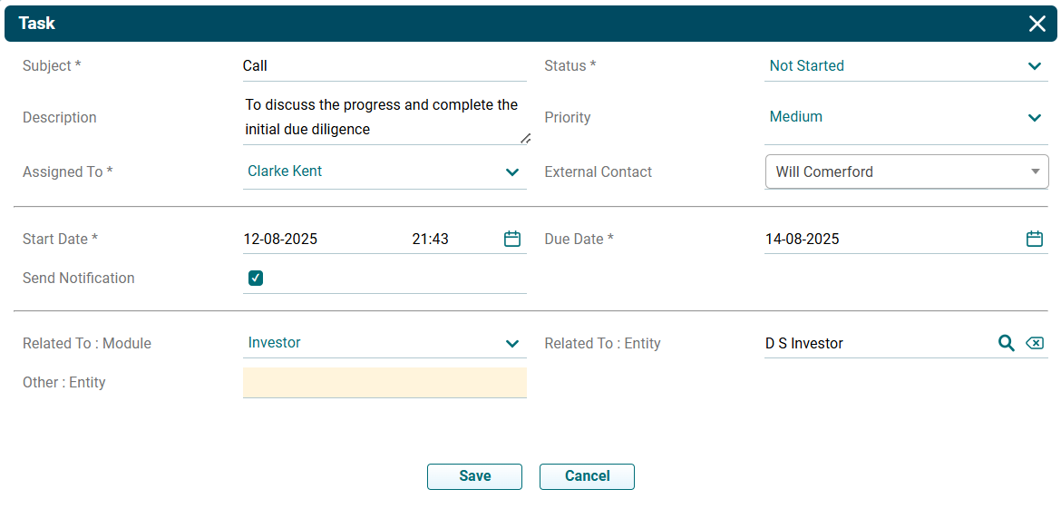 - Related To (Entity): Task gets related to the entity automatically.
