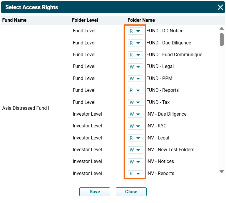 3. The Select Access Rights popup is displayed. You can see the list of all Investor-related folders. Give Read or Write access for various folders at the fund level and investor level to the user.