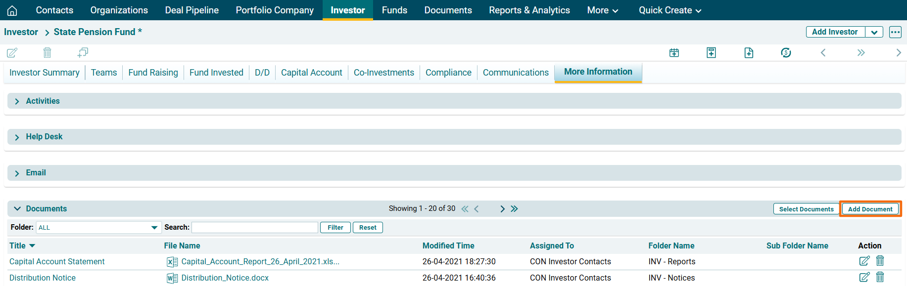 To add Investor-related documents, follow the below steps: