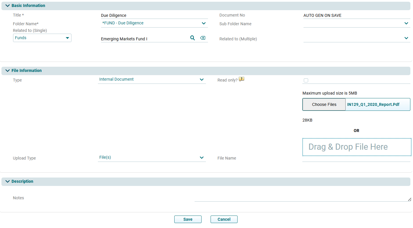 4. The Document Information window is displayed. Update the required details, attach the file and click on Save.