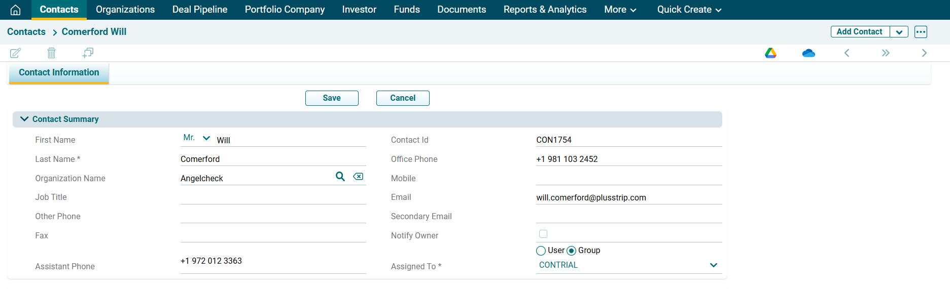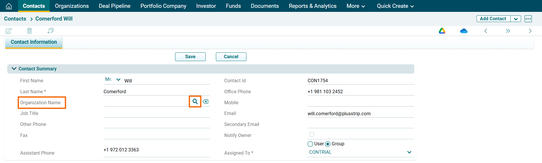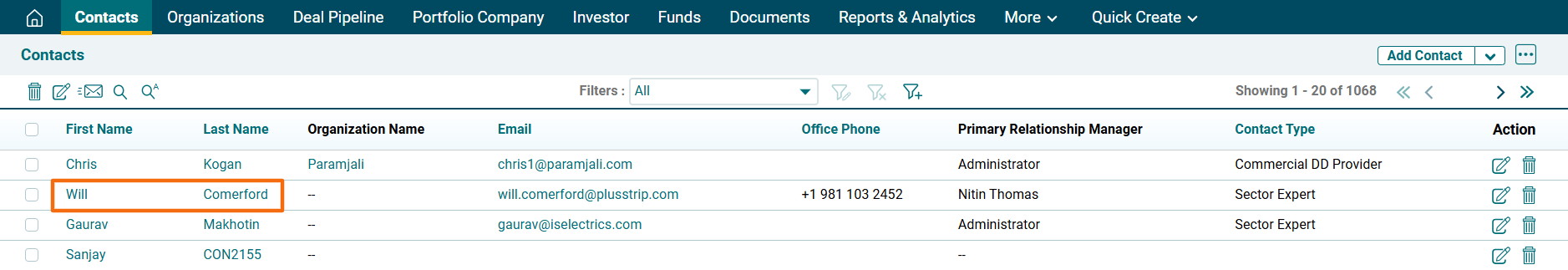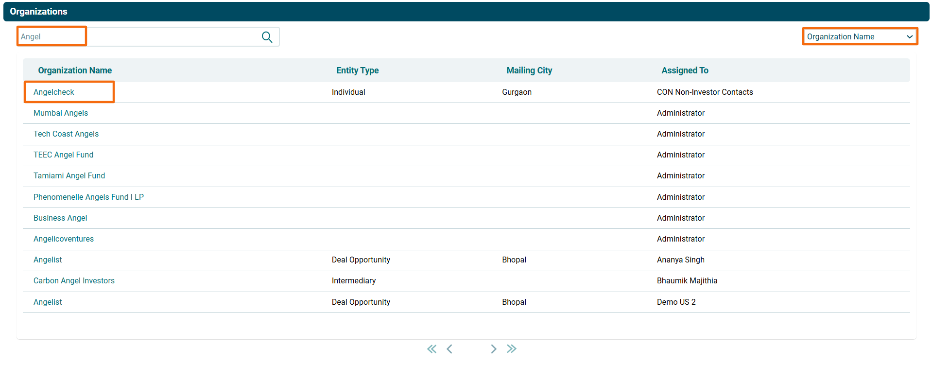 5. The Organizations window is displayed. Search for the contact name. Select the filter on the top left corner. Search results are displayed. Click on a Contact Name to add them as a member.