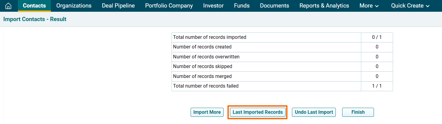 11. The Import Contacts- Result window is displayed. To view last imported records, click on Last Imported Records. The excel file will download. Check the file for the highlighted errors and fix them before importing again.