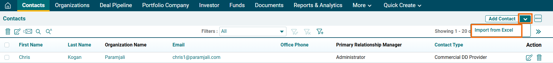 5. To import the file, click on the down arrow button beside Add Contacts button. Click on Import from Excel.