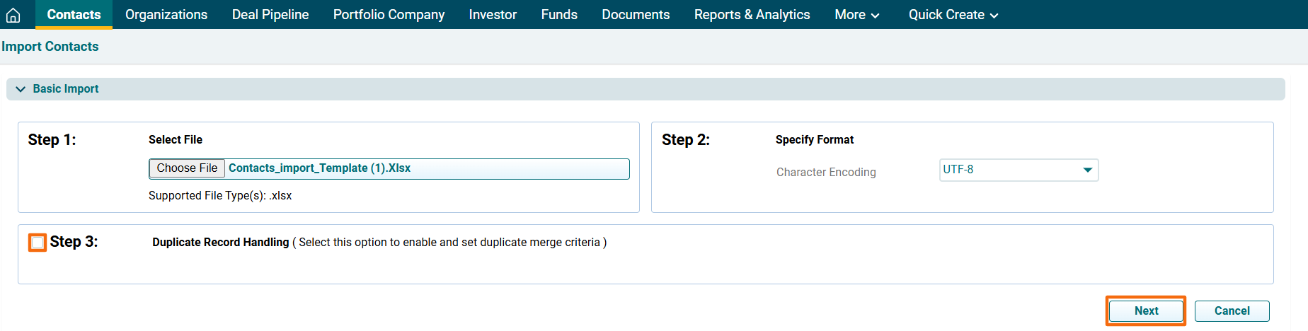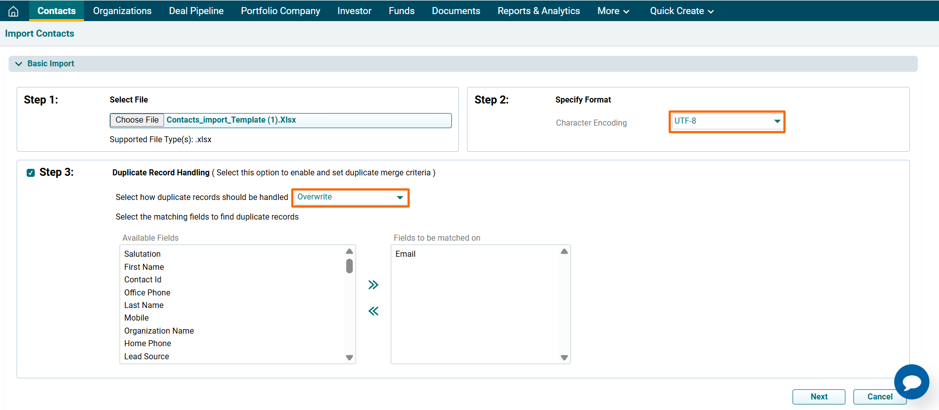 7. Specify the file type, if required. You can either specify how to deal with duplicate records from the dropdown list, i.e., Skip, Overwrite, or Merge.