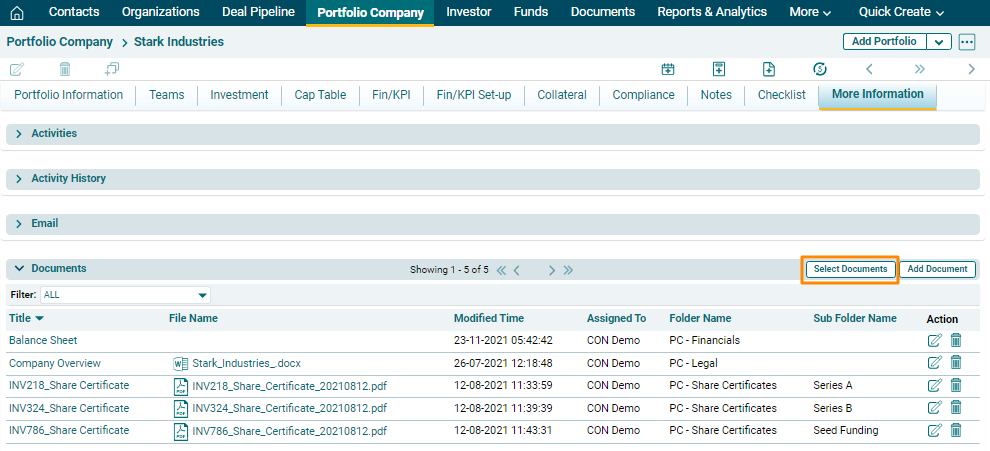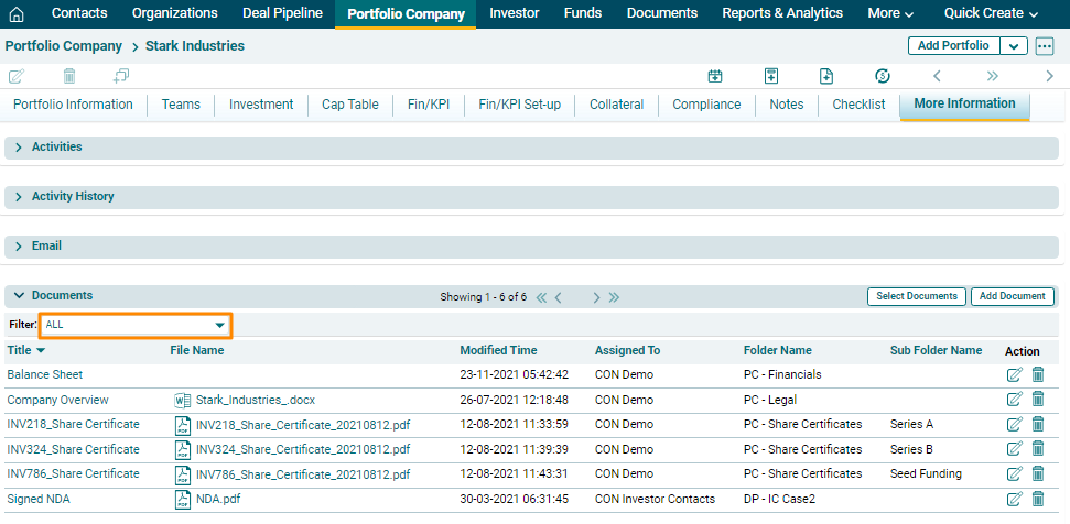 To view documents of a specific folder, you can use the filter on top left corner of the panel. You can choose a folder from PC Legal, PC Financials, PC Reports, PC Share Certificates, and PC Checklist.