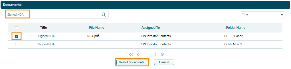 3. The Documents window is displayed. Type the file name in the search box. Check the checkbox against the file name. Click on Select Documents button.