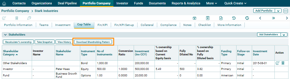 To download Cap Table data into excel, click on Download Shareholding Report button in the top left corner of the panel. The excel file will download.