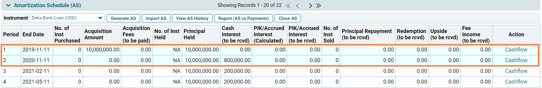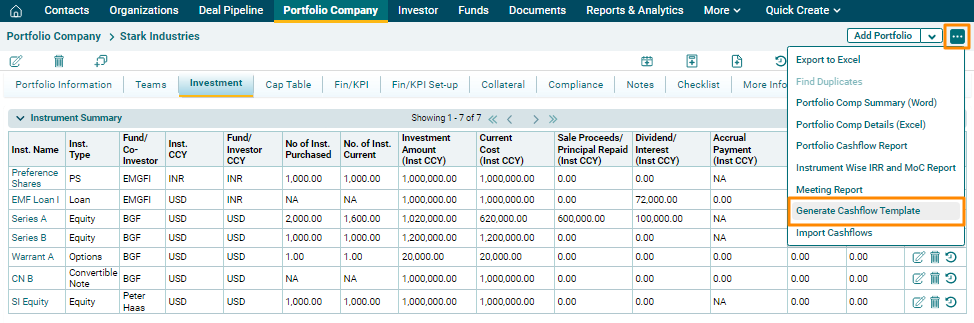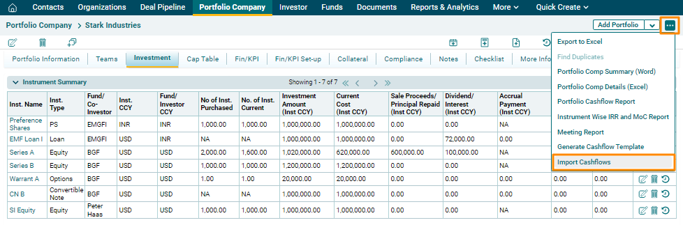 bulk cashflows for a loan instrument, click on the three dots menu next to Add