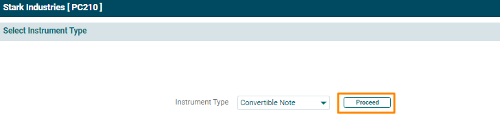 2. The Instrument Type window is displayed. Select Convertible Note from the Instrument Type dropdown list. Click Proceed.