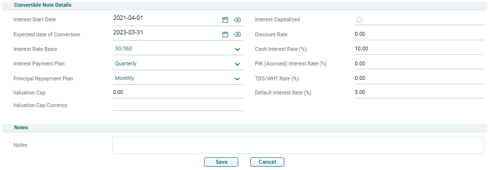 3. The Convertible Note Details window is displayed. Enter the following details: