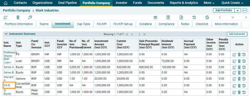 • Investee Company Name: Displays the name of the portfolio company associated with the instrument. This is an auto-generated field.
