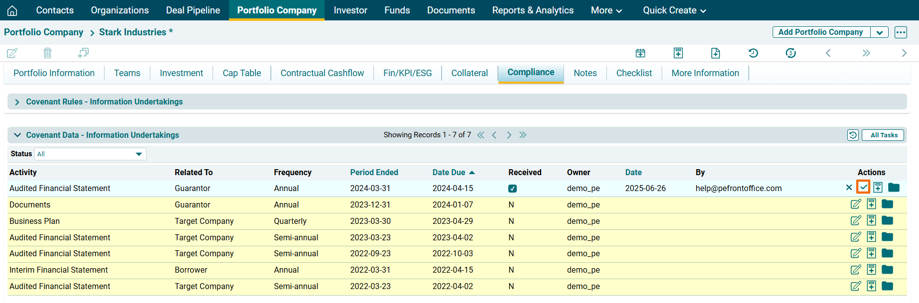 Once the rule has been defined for an item in the Compliance Rules, the Compliance Data panel allows you to capture the required documentation associated with the compliance rule.