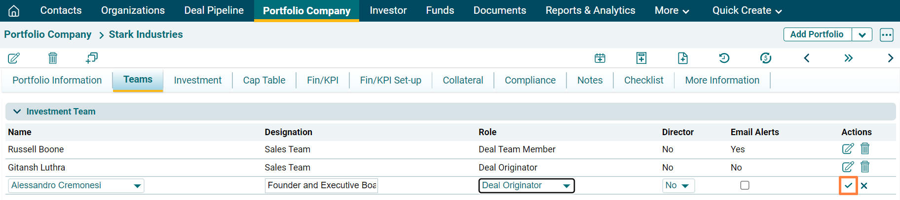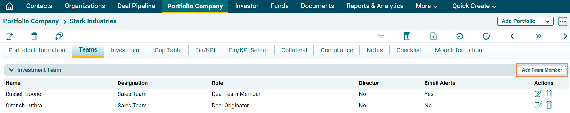 Investment Team panel captures details of internal team members associated with the portfolio. The details included are: