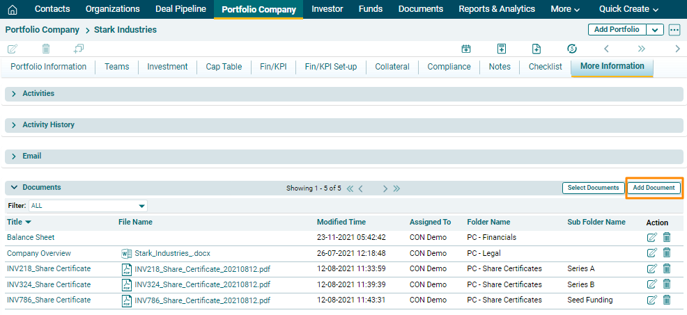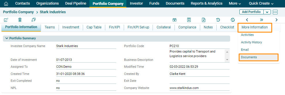 navigate to the More Information Tab and Click on Documents.