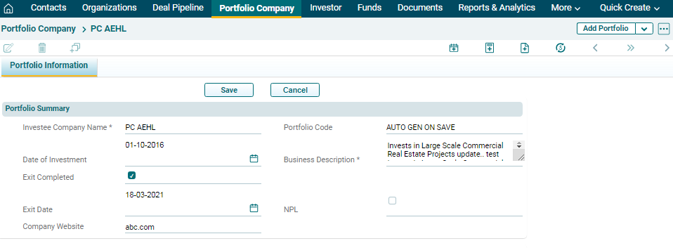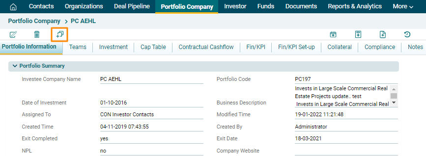 2. The Portfolio Campany Information window is displayed. Click on the Duplicate icon in the top left corner.