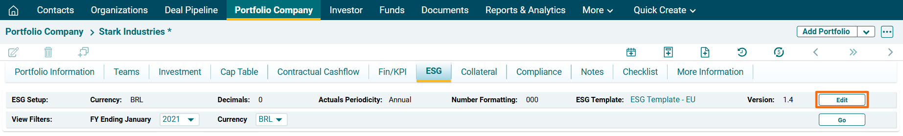 2. To setup ESG parameters, click on Edit button in the top right corner.