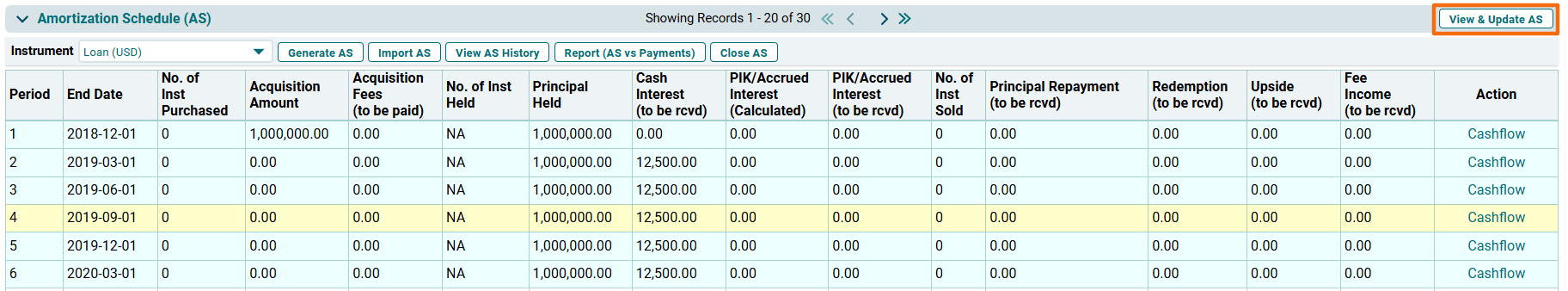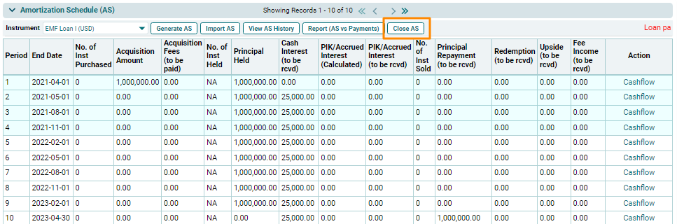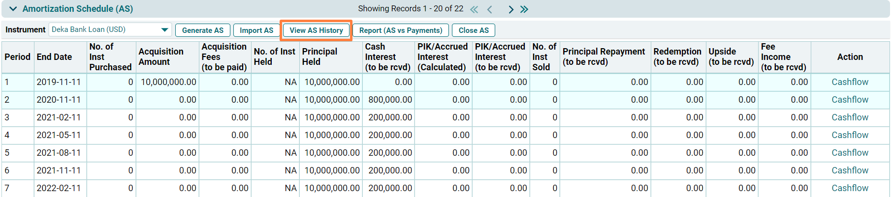 Amortization Schedule History window is displayed. You will see the details