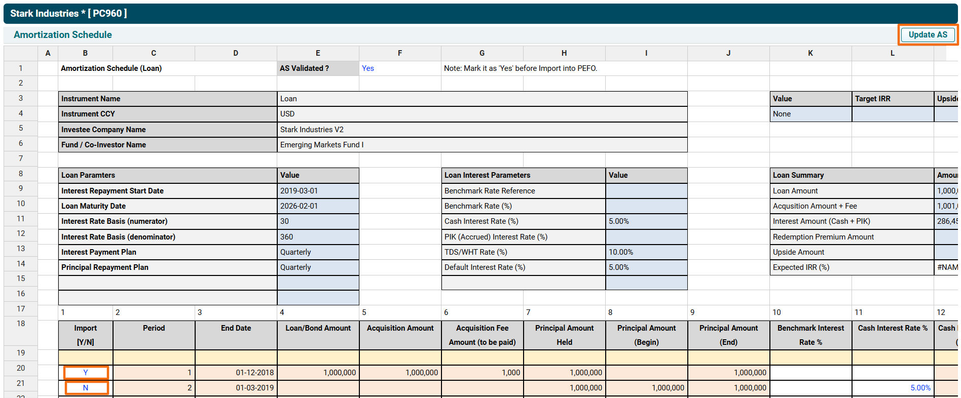 4. Update the AS. To import the specific changes, mark the related row "Y" in the Import Column. Mark the rest of the rows "N". Click Update AS button in the top right corner.