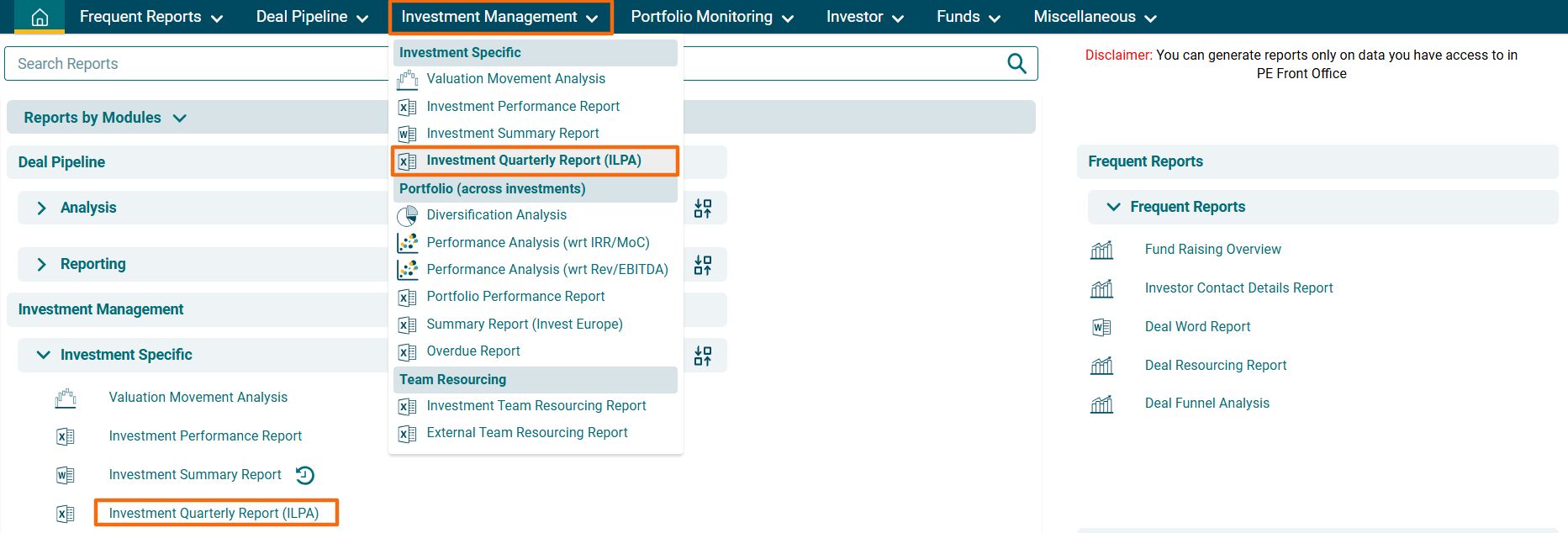 2. You can access the report from the dashboard by clicking Investment Quarterly Report (ILPA) in the Investment Management panel or from the Investment Management drop-down menu in the blue vertical bar.
