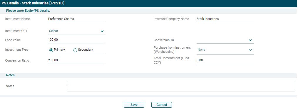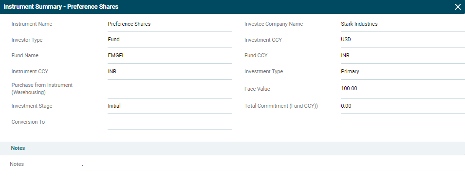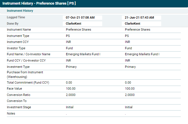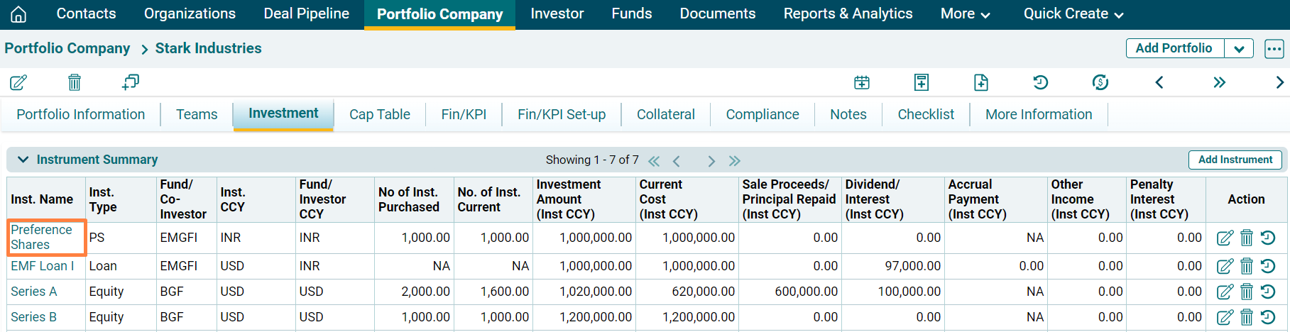 - Inst. Type: Displays the type of instrument whether equity, PS, loan, bond, convertible note and options.
