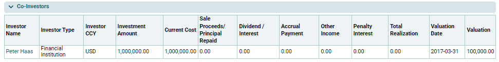 This panel allows you to view a detailed summary of investments made by co-investors in the portfolio company. The panel gets auto-populated based on the underlying transactions. The details included are:
