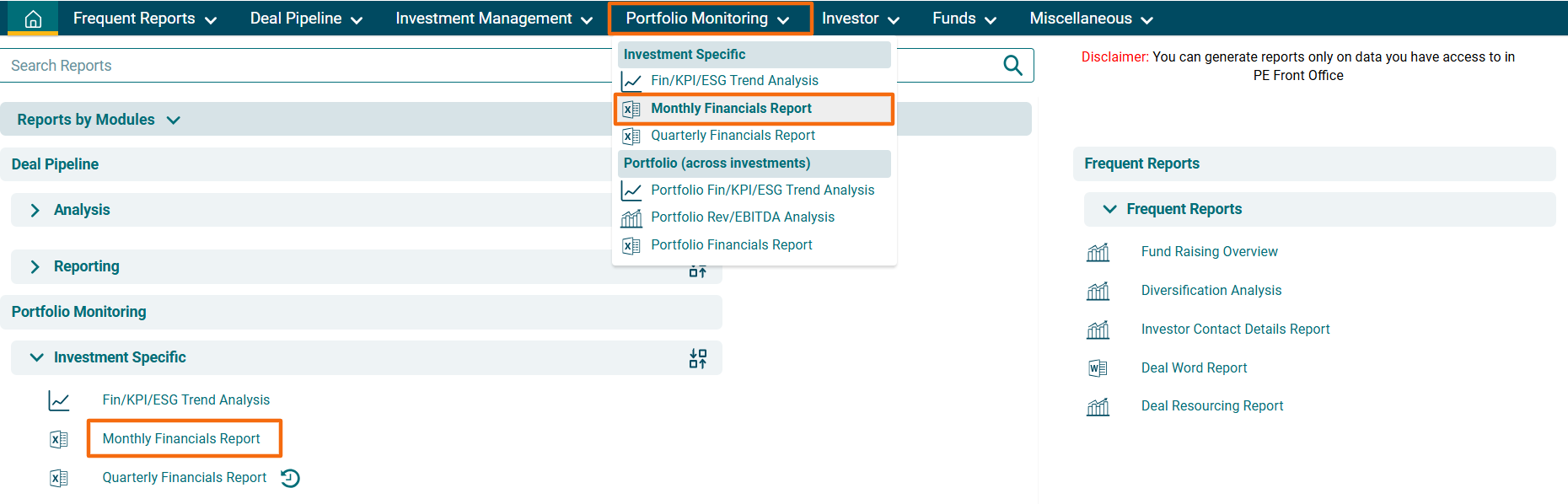2. You can access the report from the dashboard by clicking Monthly Financials Report in the Portfolio Monitoring panel or from the Portfolio Monitoring drop-down menu in the blue vertical bar.