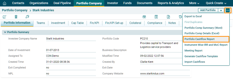 3. Click on the three dot menu in the top right corner. Click on Portfolio Cashflow Report. The report will download in excel format.