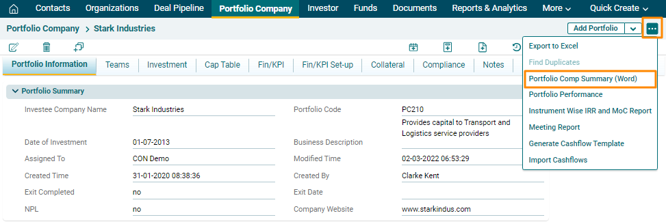 To download the summary of a portfolio company in Word, follow the below steps: