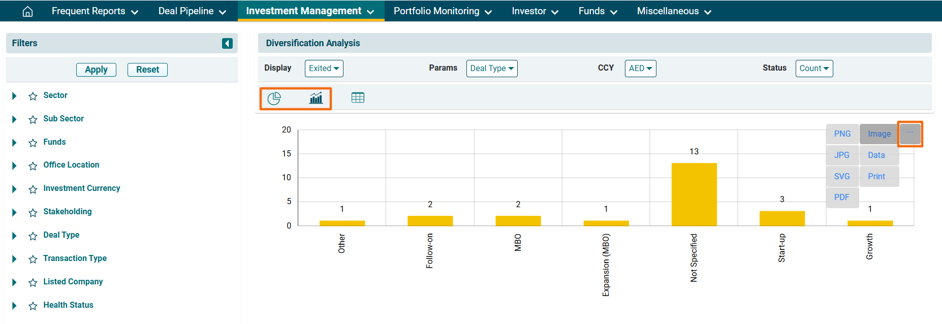5. You can view the above data in Bar Graph and Pie chart. Click on the icons below the filters to view the diversification in the desired format. You can download the report in various formats. Click on the gray square box button in the top right corner near the graph. The report can be downloaded in image formats, such as PNG, SVG, JPG, etc., and data formats, such as JSON, HTML, PDF, CSV, etc. Click on a format and the report will be downloaded.
