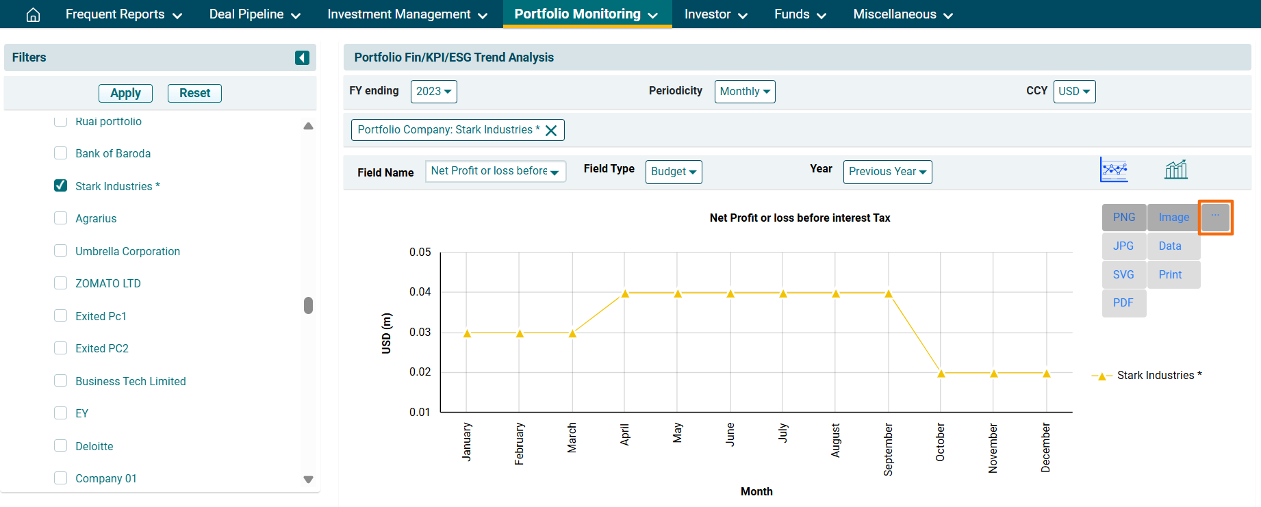 3. The Portfolio Fin/KPI/ESG Trend Analysis window is displayed. Using the filters on the left-hand side, select the Portfolio Company. Click Apply.