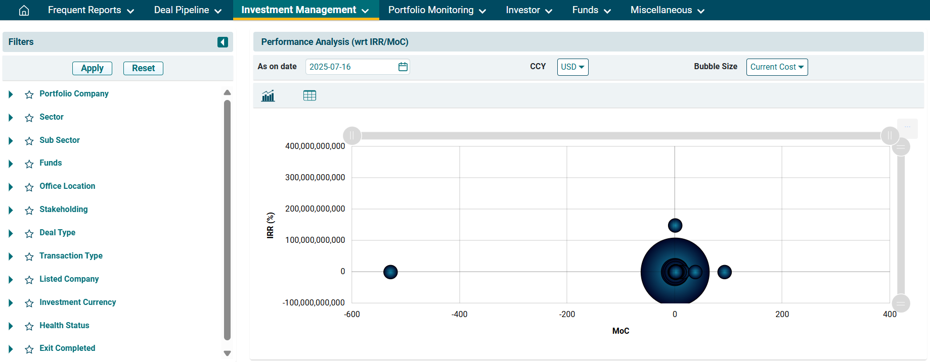 2. A new window is displayed. You can access the report from the dashboard by clicking Performance Analysis (wrt IRR/MoC) in the Investment Management panel or from the Investment Management drop-down menu in the blue vertical bar.