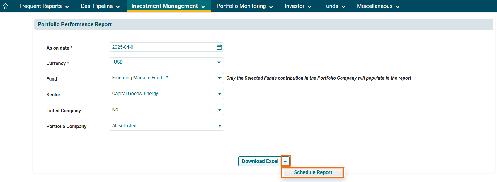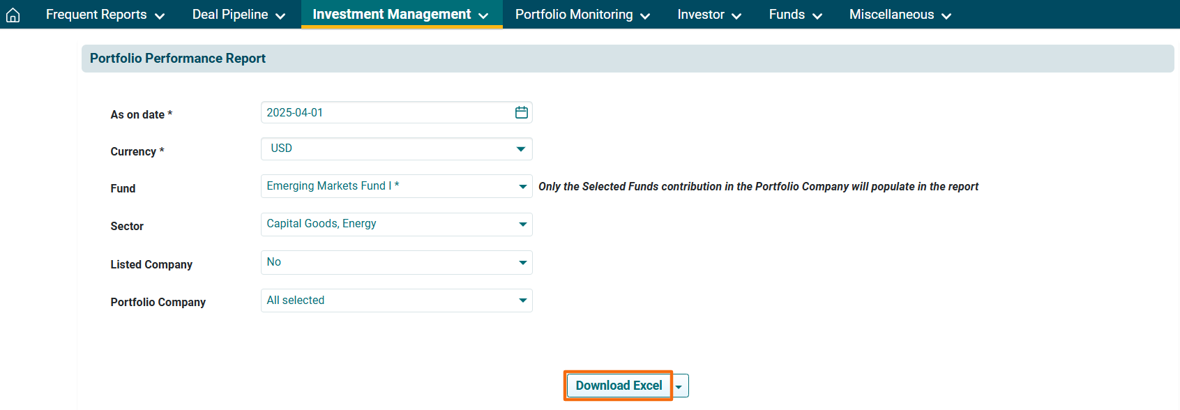 - Portfolio Company: Choose the portfolio company from the dropdown list.