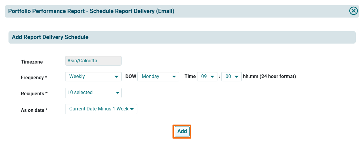 5. The Portfolio Performance Report- Schedule Report Delivery (Email) window is displayed. The details included are: