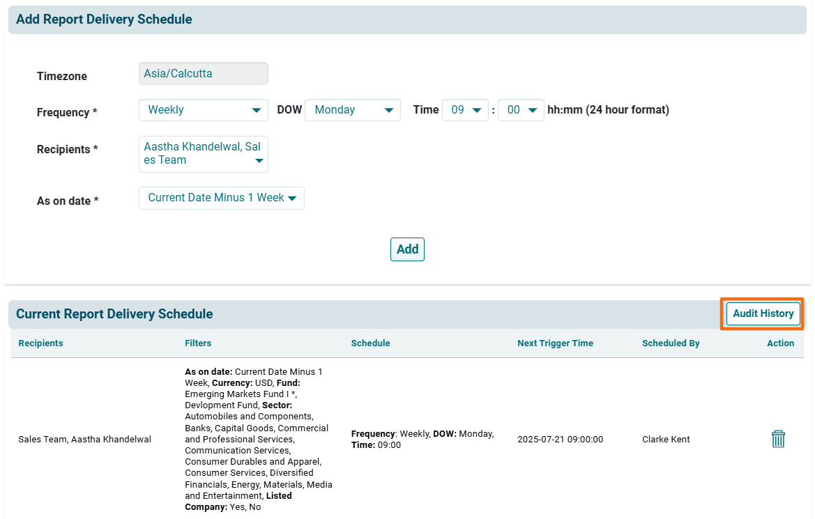 - Frequency: Choose the frequency of the report delivery, i.e., Daily, Weekly, Monthly or Annually. Choose Time.