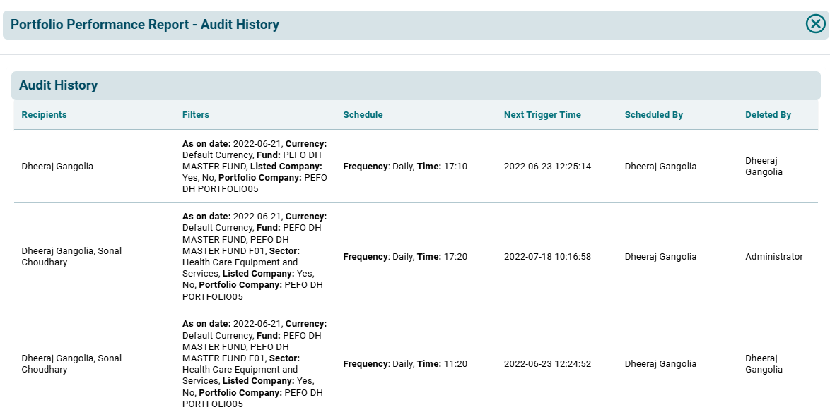 9. The Portfolio Performance Report-Audit History window is displayed.