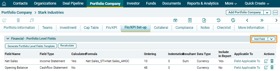 4. To import Investee Company Specific fields, click on the down arrow button next to Add Field button. Click on Import Investee Company Specific Fields.