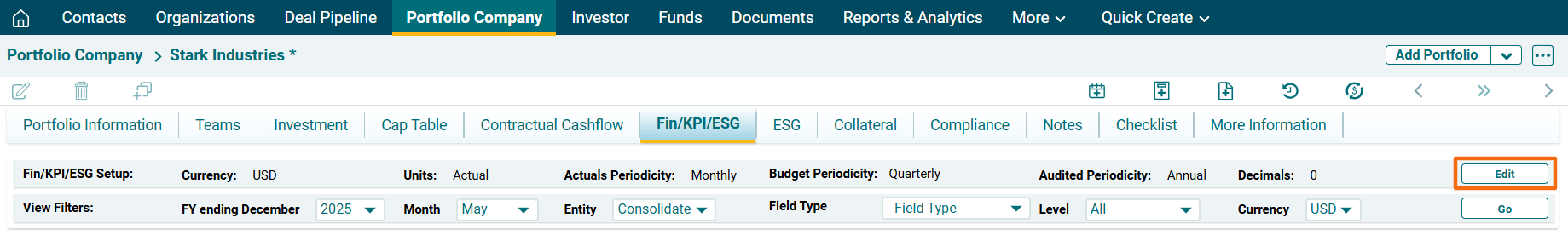1. Navigate to Fin/KPI tab and click Edit. Fin/KPI Set-up Tab will be displayed.