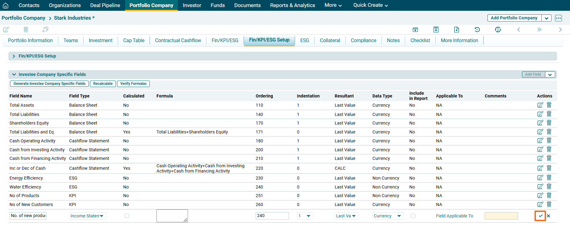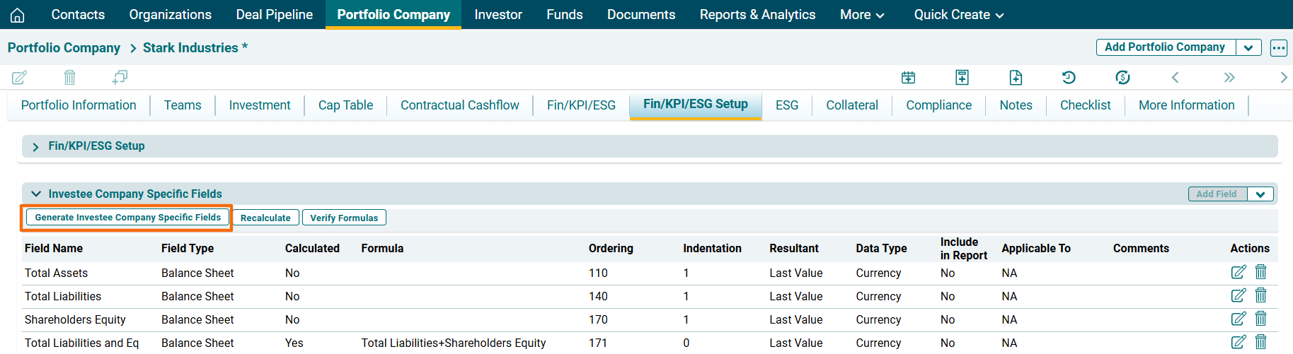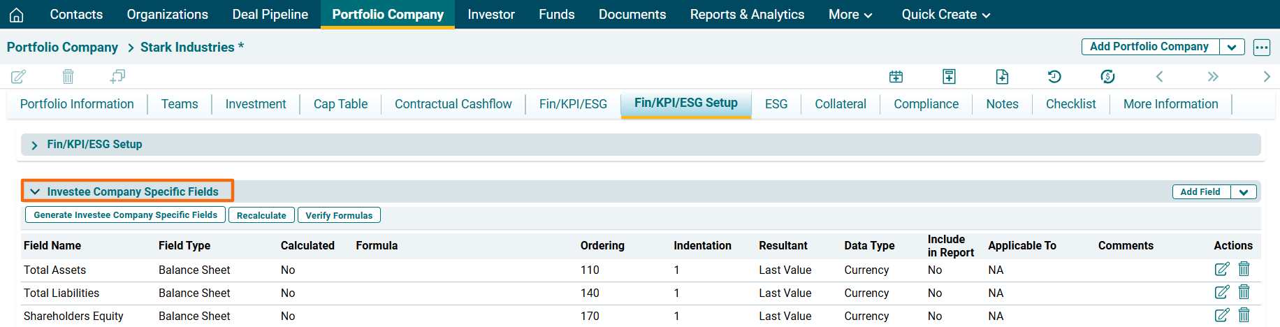 Navigate to Investee Company Specific Fields panel.